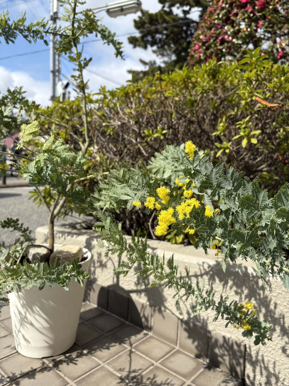 当店入口にもミモザの花と